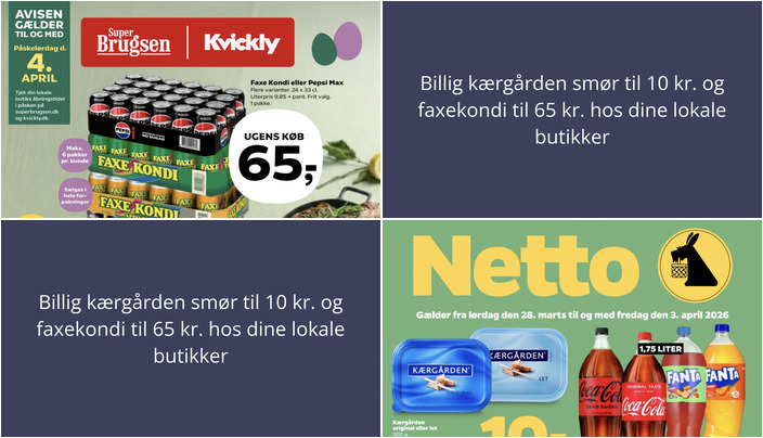SuperBrugsen tilbyder en pakke med 24 x 33 cl Faxekondi eller Pepsi Max til kun 65 kr. pr. pakke + pant. Der er en begrænsning på maksimalt 6 pakker pr. kunde. Tilbuddet gælder fra fredag den 27. marts til lørdag den 4. april.
